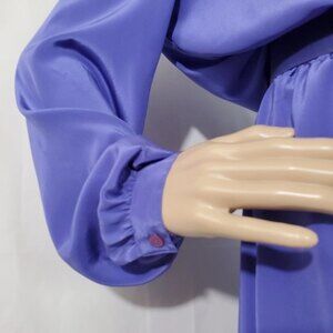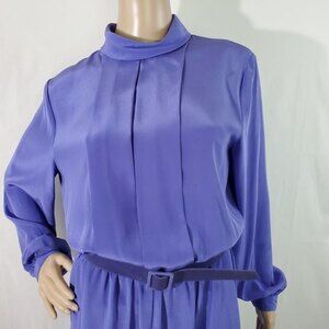 Classy and beautiful style of dress from Korean brand HANA SUNG featuring lavender purple color with turtle-neck style, long sleeves with button cuffs, pleated and belted skirt, button-up closure on the back, pleated on the front, very flattering style.