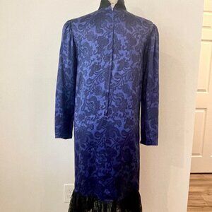Designed for a size 6, the dress drapes beautifully, highlighting its timeless silhouette. The intricate pattern in the fabric adds a touch of mystery and allure, while the subtle sheen of the silk enhances its upscale appearance.
