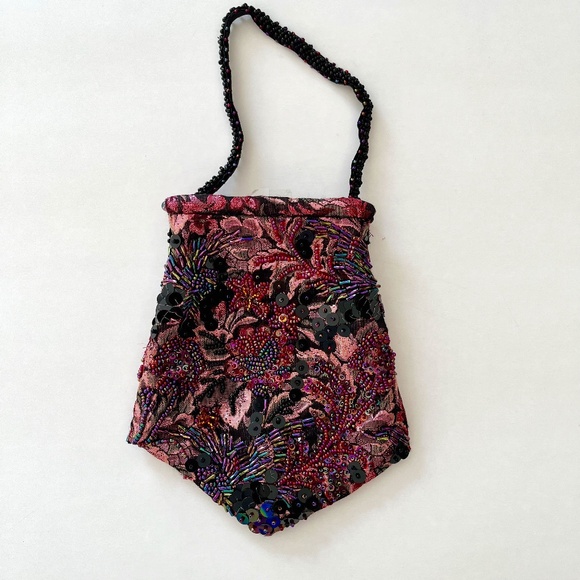 Hand beading on metallic brocade type fabric with silk satin lining. Measures 8' x 6.5". Unused.