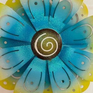 Featuring vibrant blue and yellow petals with playful glitter accents, this unique piece is perfect for garden decor, a little girl's bedroom, or a whimsical indoor display.