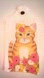 Sweet brown kitty with colorful flowers on a white background with a white crocheted top and brown button closure