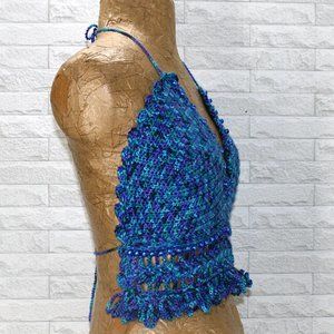 HAND CRAFTED Cropped Top Crochet Halter Festival Fashion Blue Colorful Large