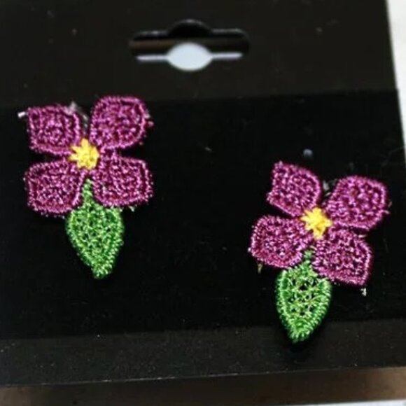 HAND CRAFTED Earrings Violet Floral Embroidered Spring Easter Pierced Purple Set
