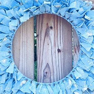 It is made from fabric that has been cut into strips and tied to a wreath ring.