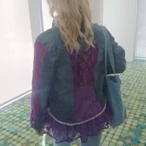 HAND CRAFTED Jacket Denim Upcycled Blue Jean Purple Lace Embellished XL