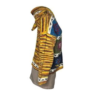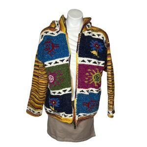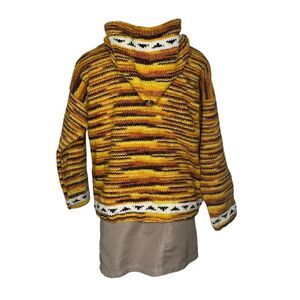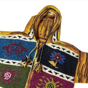 This is a multi-colored, striped, zip-up wool sweater with a hood. It features a patchwork design with various geometric and nature-inspired patterns. The sleeves have a striped pattern and the sweater has two front pockets. Hood ends in a point and has drawstring with tasseled ends. There is a native quality to the pattern that I have seen described as Peruvian or Ecuadorian. Dopamine colors ensure a happy day when you wear this sweater. It is preowned with no major flaws. As it is handmade, there is no size. I would say it’s a medium to large based on measurements and fit. No major flaws.