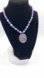 Gorgeous handmade statement necklace with 8mm Larimar Quartz and brilliant 8mm purple pearl beads with gold plated spacers. Focal pendant is an imperial jasper stone with purple, blue and gold swirls hand beaded with gold and purple seed beads with tiny sky blue Preciosa crystals around the edge. Finished with black faux leather on the back.