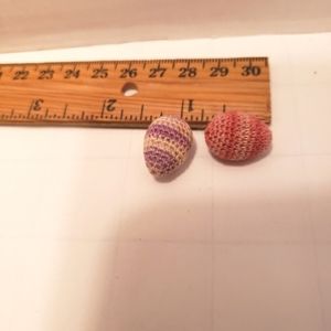 These are sooo special because they are so tiny. I hand crochet them using size 10 or 20 threads and stuff with fiberfill. VERY Difficult! I hang them on the Easter Holiday egg tree. ( Do people still have those? ) They're a curiosity that can go anywhere in the home. Holiday or anytime shelf decor, rustic farmhouse, Even the dollhouse! This is a yellow mini basket with 2 eggs , 1 pink stripe and 1 purple stripe.