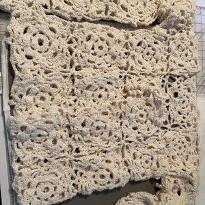 HAND MADE CROCHET WOMEN'S/TEEN CREAM SWEATER XS/S. Pre-owned, hardly worn. Excellent Condition. Item is an Ecru/Natural color with luminescent threads. Fits a 32" to 34" bust, very stretchy weave. Should fit a women's extra small to small size. Perfect for a casual sweater on a cool day to a formal coverup for evening dress. Sweater has curly crochet ties at neckline.