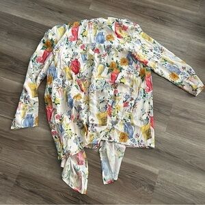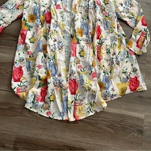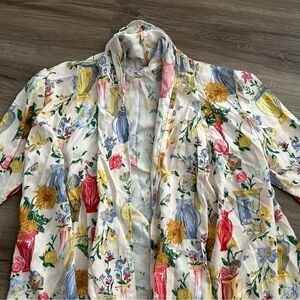 HAND MADE Open Novelty Front Vase Floral Print Cardigan Fit Women Medium in great condition/ non stretchy/ slight puff shoulders/ artsy novelty print