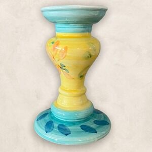 HAND PAINTED Candlestick Shabby Chic Floral Yellow Blue Floral Decorative EUC