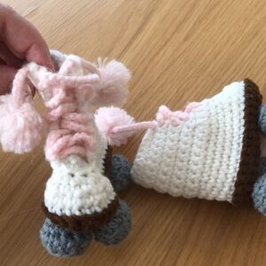 HAND knit vintage white roller skates with pink laces