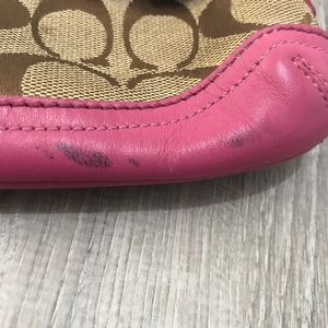 Coach handbag, size small, used- good condition, pink and brown. Small stain on the bottom outer bag.