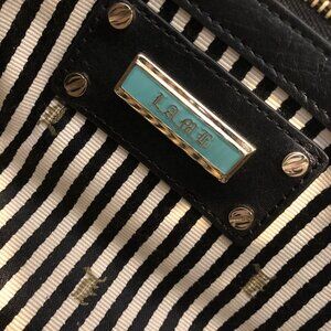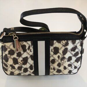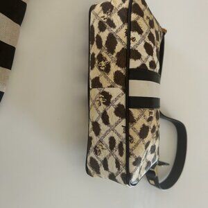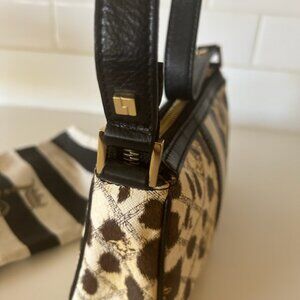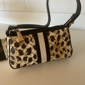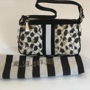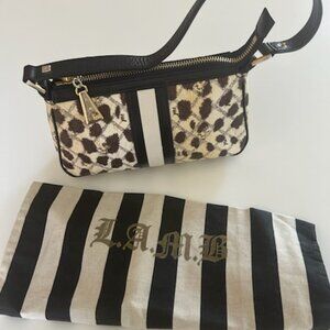 L.A.M.B. Cream, brown animal like print with diagonal link chain design. Black, white strip down front and back. Black handle - shoulder strap. Leather