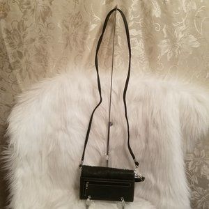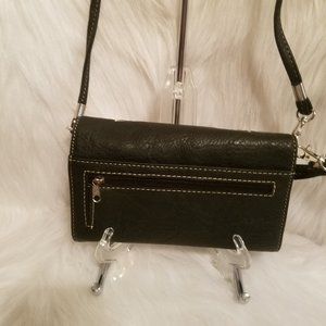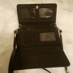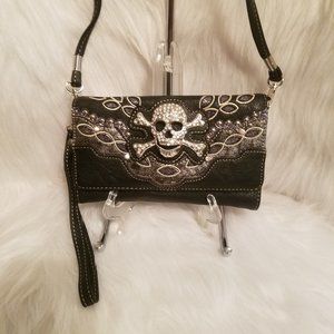 Handbag express western skull rhinestone wristlet A tri-fold full featured wallet with a two chamber accordion section three clear ID windows has interior zippered pocket , nine slots for credit cards flat currency compartments an exterior pocket on the back has detachable shoulder and wrist strap .Strap has 24 inch drop length top flap with magnetic snap closure simulated leather construction fully lined interior silver toned hardware.APPROX SIZE 7.5Lx4Hx1.75W. Brand new no tags