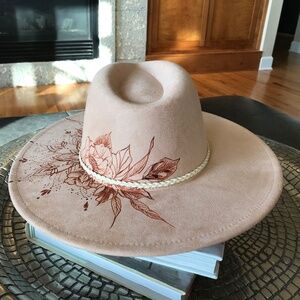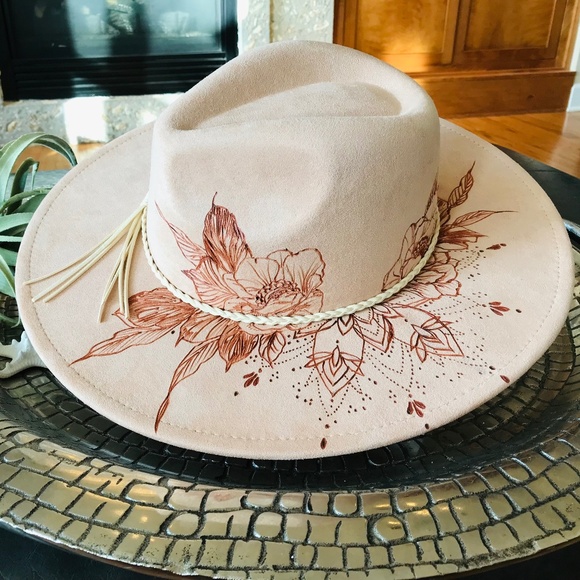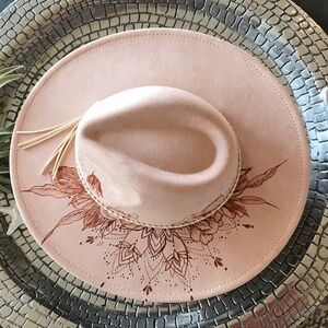 This is a new hand-burned peach cream wide-brim rancher hat, also known as the "Mary's Rose" hat