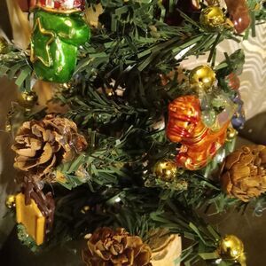 HANDCRAFTED 11" MINI PREDECORATED CHRISTMAS TREE. All pine cones (real & treated) and ornaments are secured with hot glue. ONE-OF-A-KIND CHRISTMAS ART! Variety of resin mini ornaments from cute mittens to Santa. Fluff and place...perfect for the kitchen, bathroom, kids room, and shelf decor.
