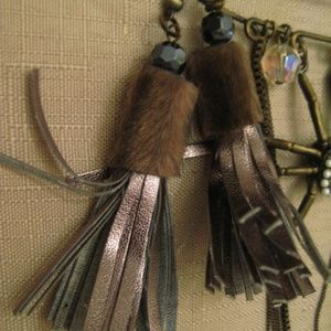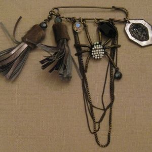 Un Worn handcrafted brooch brass pin rhinestone eyes white beads brass spider rhinestone eyes faux pearl beads dangle black bead 2 faux fur faux leather tassels black faceted bead black glass gemstone crystal bead abstract charm pendant faux leather metal chain sparkles 5 brass chains dangling from large brass safety pin. Tassels 1 & 15/16" length 1" width. Spider length includes black bead.2 & 3/8. Faux leather pendant length 1 & 9/16" width 1 & 1/8. Total Measurement 5 & 3/8" X 3 & 1/8"