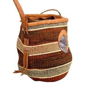 HANDCRAFTED BEIGE BROWN JUTE BROWN LEATHER HANDLES BASKET SHOULDER BAG X-BODY PURSE