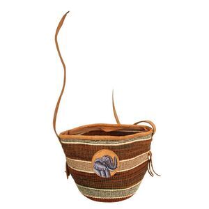 HANDCRAFTED BEIGE BROWN JUTE BROWN LEATHER HANDLES BASKET SHOULDER BAG X-BODY PURSE