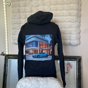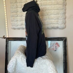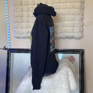 HANDCRAFTED Hooded sweat-shirt black with digital art works My own personal design printed with Amazon with my name at the bottom of both pictures warn once and washed only one out there unless I print more .