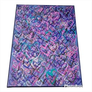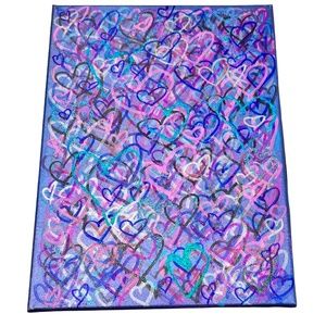 Handcrafted colorful graffiti hearts. Mixed media. Acrylic paint, glitter glue, and alcohol based markers. Hearts are pink, purple, blue, and black. Background is shiny blue/purple. Layers of hearts to love! Easy to hang with command strips - very lightweight. 9" x 12". Amy is the artist and my mom.