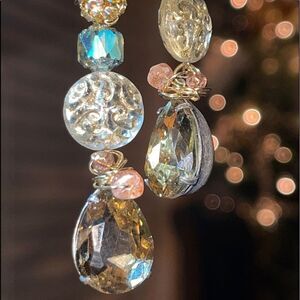 One of a kind shimmery, boho earrings. Aurora Borealis crystal beads, iridescent Czech glass beads, gilded/etched beads with sunstone wire wraps set atop large amber crystal drops, on 14k gold-plated earwires.
