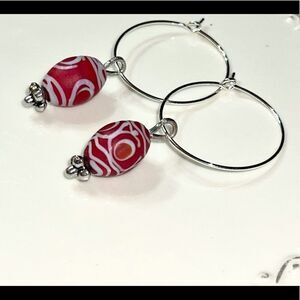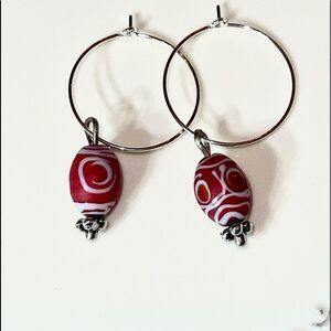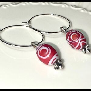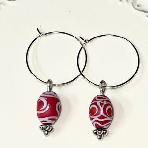 Dainty silver-tone hoops and red & white polymer clay bead earrings.