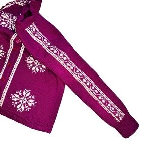 This rare, handknit vintage cardigan sweater has a beautiful magenta purple color with a white snowflake pattern on the front and back. The outer sleeves and front button area have a white accent pattern as well. A truly unique piece to wear on the ski slopes or cozied up be the fire with hot chocolate.