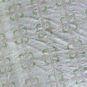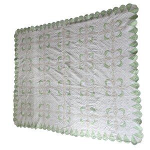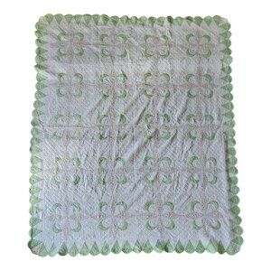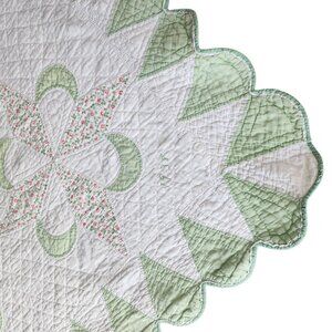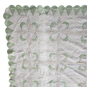 Up for consideration is a vintage handmade quilt featuring a delicate clover and star motif in soft green and pink floral prints on a white background. This heirloom-quality piece showcases intricate appliqué and fine hand-quilting throughout, framed by a striking scalloped border with alternating green triangle segments. The charming pattern and pastel tones give it a true cottagecore aesthetic. perfect for farmhouse decor, a shabby chic bedroom, or vintage quilt collectors. This quilt is in beautiful preowned condition with minor signs of wear consistent with age, a few tiny holes to the top side and a few faint small stains to the backside. A truly special piece of textile art! dated 1938.