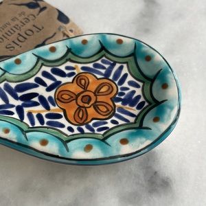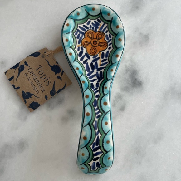 Beautiful hand painted hand made spoon rest in vibrant blues and golden yellows (orange?). Artisans products of Guatemala.