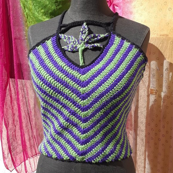 I used green and purple acrylic yarn to crochet this fun wacky-leaf striped tie-back top. Made to sell, so it hasn't been used, modeled for picture only. Fits average adult medium thru extra large comfortably. Thank you for your interest in my handmade goodie 🤩