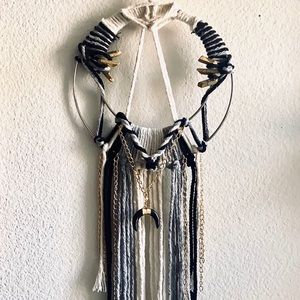 This handmade piece makes an energetic statement in any space by combining fun gold metallic with moody boho cord. Materials include a 10 inch base wrapped with black, cream and gray cotton cord that extend 12 inches from the bottom. Intertwined in this design are 6 gold raw cut crystals that show off an acrylic black and gold crescent horn pendant hanging from matching gold links. The hanging cord is cut extra long for you to adjust to any desired length. 100% handmade one-of-a-kind work 🌙