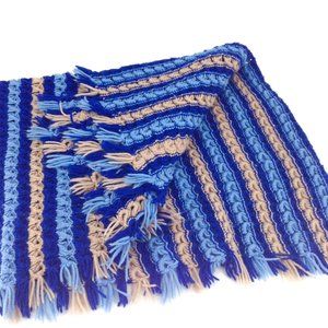 Handmade Crochet Afghan Throw/Blanket is a cozy loop chain style crochet with fringes in three distinct colors: Cobalt Blue, Cream Ivory/Beige, and Baby Blue. Perfect for keeping warm as you read, listen to the birds, journal or simply keep as a home decor in your living room, bedroom or guest room.