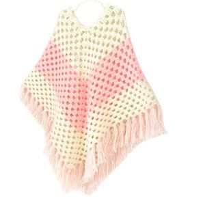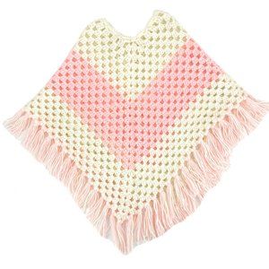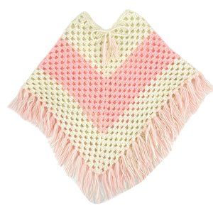 Description: Special touch of crochet is the greatest way to style a little girl for the autumn. This poncho has a custom knitted design with alternating V shape pattern of cream ivory and pink throughout the outerwear. Along the neck, there is special detail around the rounded neck including a tie with two tone, color block tassel. Fringe of cream ivory and pink follows the hem around the entire crochet poncho. Style this poncho with a solid cream or baby pink turtleneck, crewneck with contrasted cream ivory or pink pants to finish with riding boots. Crochet Poncho | Girls Crochet Clothing| Two Tone Crochet Poncho | Outerwear
