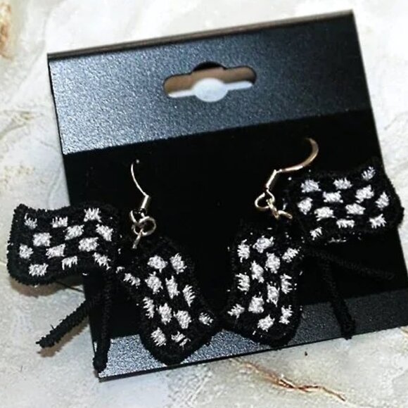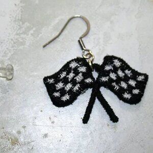HANDMADE Earrings Checkered Flags Race Win Embroidered Pierced Black White