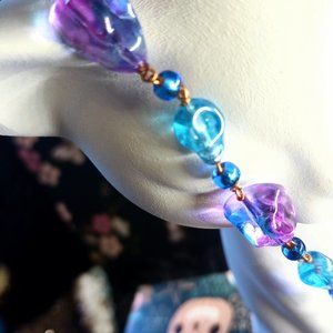 The beads alternate between blue crystal skulls and blue/purple Czech glass rabbits. They range from blue to purple in color.