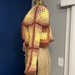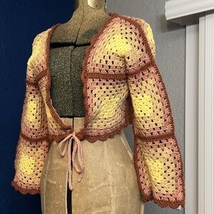 Handmade Granny squares crop knit crochet tie front top & bell sleeves Gently pre owned condition. Has a few almost pulls as seen in pics fits size small or oversized XS. So cute. Very well made.