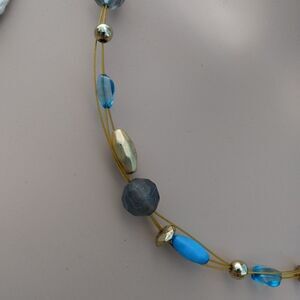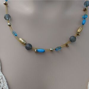 HANDMADE Gold, Blue & Gray Glass Beaded Necklace on Gold Wires w/Claw Closure