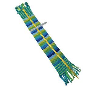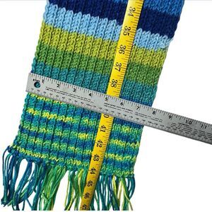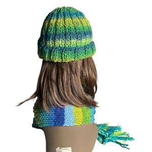 HANDMADE Knit Scarf & Beanie Hat Set Multicolor Blue Green Yellow Fringe