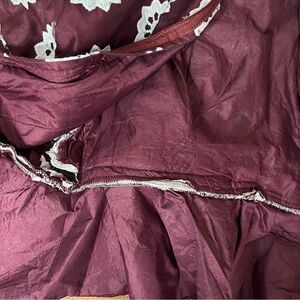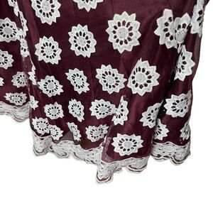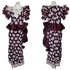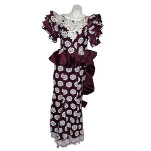 Elevate your wardrobe with this enchanting wine color maxi dress, perfect for any formal occasion. The dress boasts a stunning abstract pattern of lace that exudes femininity and grace. It offers a flattering long silhouette that gracefully skims the body. I have listed this as a medium, but could also work for a large. Please make sure to consider measurements provided below. Gently worn.