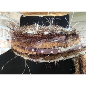 HANDMADE Necklace Scarf Brownie Dots Fringe Boho Eyelash Yarn Batik Fabric Brown White Green