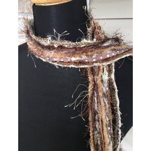 Scarf is long & super skinny measuring approx. 68" L & 2" W. Each scarf is unique & one of a kind. Length, width, fabric & yarn placement can vary some.) Made with multiple fabrics & fibers - including some really unique & luxurious yarns.