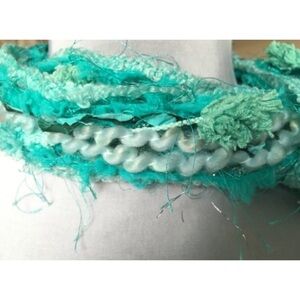 Scarf is long & super skinny measuring approx. 68" L & 2" W. Each scarf is unique & one of a kind. Length, width, fabric & yarn placement can vary. Made w/ multiple fabrics & fibers - including some really unique & luxurious yarns.
