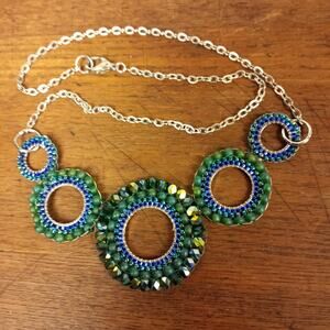 Necklace has 5 rings made with blue, green and teal iridescent beads and silver tone chain. 20" long.