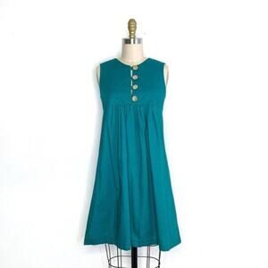 HANDMADE Sleeveless Teal Blue Green Cotton A-Line Mini Dress w/ Wood Buttons XS