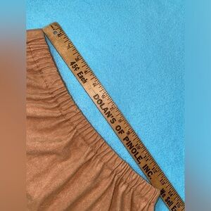 Tiered faux suede lightweight material ruffles tan homemade maxi skirt elastic stretchy waistband. Waistband can stretch to 20”.