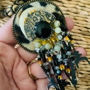 A STUNNING DESIGN CREATED WITH highly polished BEAUTIFUL BLACK ONYX ROUND CABOCHON STONE….AND LEOPARD STONE… CRYSTAL AND DELICATE DANGLING STONE & Glass beads with unusual metal cascading charms