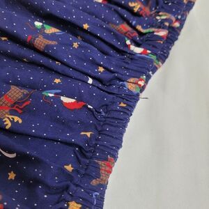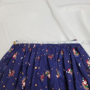 Santa and reindeer blue elastic waist circle mini skirt. Handmade item so it has so size. Feels like a cotton fabric. Adorable for the holidays with a pair of tights. Very stretchy waistband, might fit a medium as well.