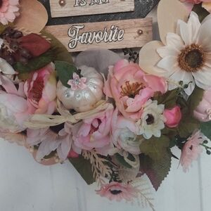 9Beautiful handmaid fall glam decor wreath About 18 to 20" total Beautiful light pink and Cream colored sunflowers and peonies And some light pink and pearl painted pumpkins With added lace small rhinestones and small pearls